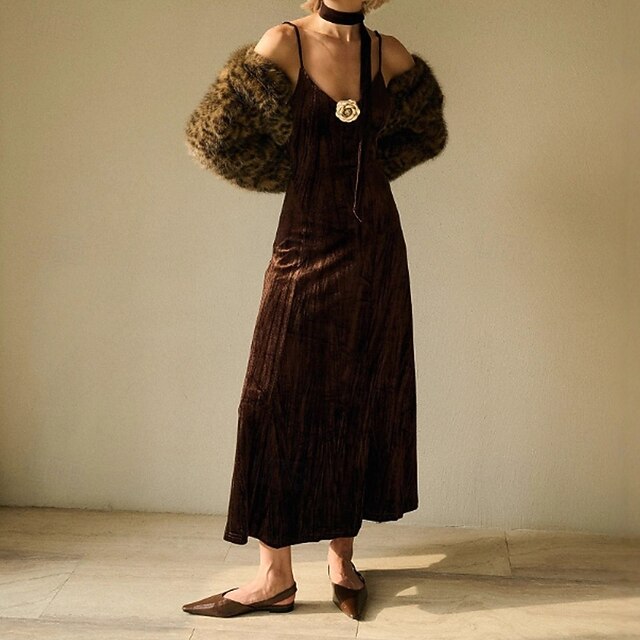 HOT ! Women's Midi Dress Velvet Dress Vintage Dress Cocktail Dress Slip Dress Vintage Fashion Outdoor Birthday Evening Party Regular Fit Plain Sleeveless Straps Brown Summer