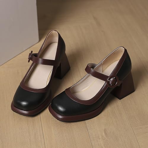 Women's Square Toe Chunky Heel Mary Jane Shoes with Adjustable Ankle Strap,Retro Leather Platform Block High Heels Pumps Shoes for Office Party Casual Wedding