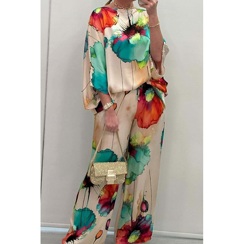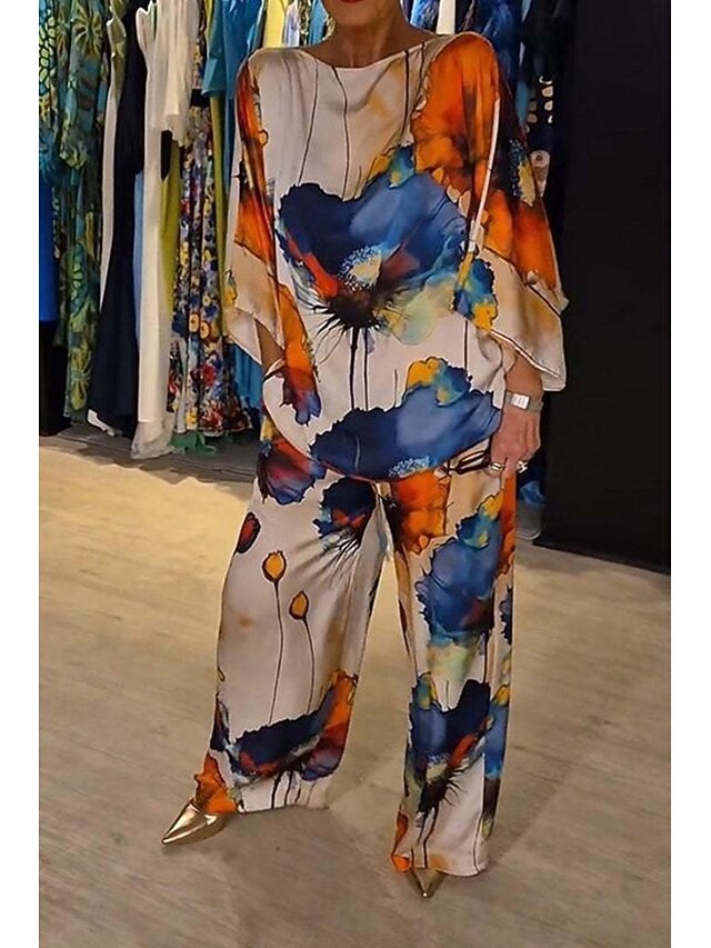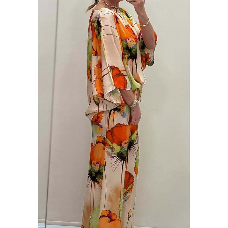 HOT ! Women's 2 Pieces Vacation Streetwear Daily Pants Sets 3/4 Length Sleeve Crew Neck Floral Print Casual Daily Black Blue Orange Summer Regular Fit