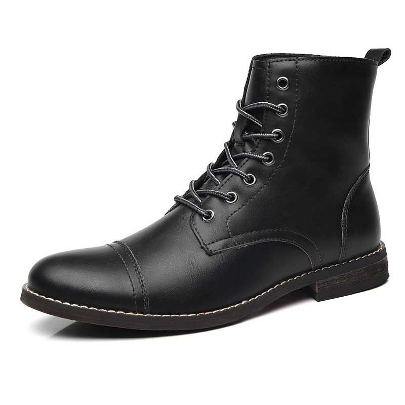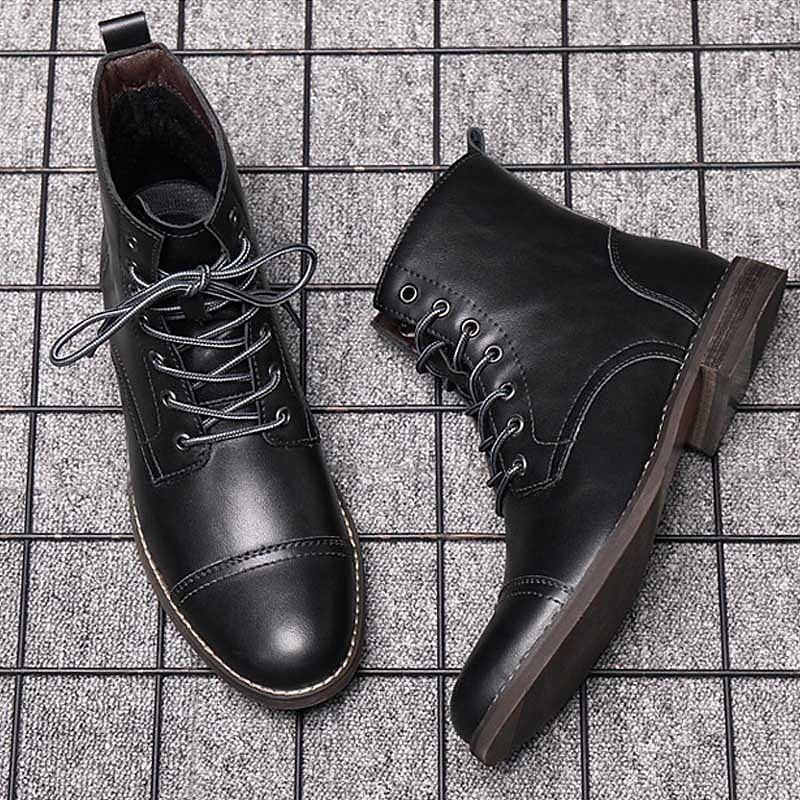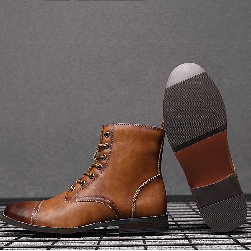 Highlights [Men's Vintage Combat Boots Highlights] [Material and Construction:] Crafted from high-quality PU leather, these men's boots offer a classic yet durable design. The rich tones of dark brown, black, and light brown add a sophisticated edge, while the splicing embellishment provides a unique aesthetic appeal. [Fit and Style:] Featuring a round toe shape and a classic vintage style, these mid-calf boots are designed for both comfort and fashion. The lace-up closure ensures a secure, adjustable fit, great for all-day wear. [Design Highlights:] The boots are designed with contrasting durable stitching and metal eyelets for enhanced durability and visual appeal. The solid-colored pattern and robust construction make these boots a timeless addition to any wardrobe. [Versatile Occasions:] Perfect for daily wear, office settings, or career-focused environments, these boots are a versatile choice for the fall and winter seasons. They seamlessly transition from casual to semi-formal occasions, offering practicality and elegance. [Size Range:] Available in a wide range of sizes from 38 to 48, these boots cater to various foot sizes, ensuring a comfortable fit for everyone.