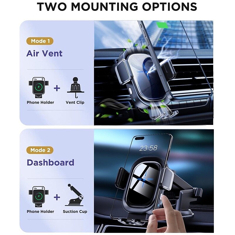 Highlights - 15W Qi Fast Wireless Charger: Our upgraded chip allows for intelligent and safe charging at the fastest speed for Qi-enabled devices. It supports 15W Max Charging Speed for LG V50/V40/V30+, 10W Fast Charger for Samsung Galaxy S23 Ultra/S22+/S21/S20/Note 10+, 7.5W Fast Charger for iPhone 14/13/12 Pro Max/11/XS Max/X, and 5W for other compatible phones. - Intelligent Identification & Smart Charging: Our phone car mount automatically clamps your phone when connected, providing convenience and enhanced safety. It also intelligently powers off and protects your phone's battery when it's fully charged. - Case Friendly & Flexible Angle Adjustment: Our phone holder for car allows for hassle-free charging through phone cases up to 6mm thick. The 360Β° rotating sphere and retractable & foldable bracket allow you to adjust the angle to your preference for optimal viewing and safe driving. - 2-In-1 Design: Simplify your life with our versatile wireless charger and car cell phone holder. It ensures a secure hands-free experience, eliminating the hassle of tangled cords or cables. Compatible with car windshields, dashboards, and air vents for convenient GPS navigation and phone calls. superb for everyday use. superior materials and excellent craftsmanship ensure long-lasting durability.