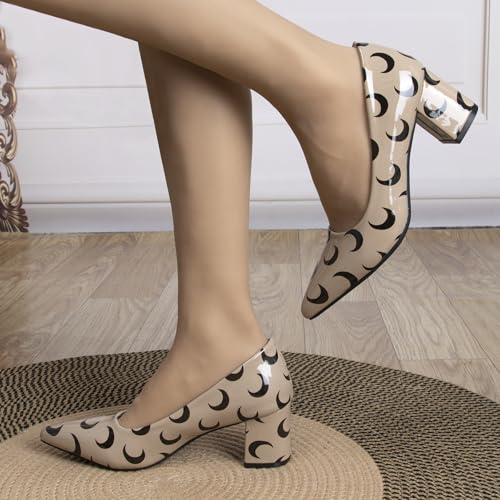 Pointed Toe Low Block Pumps for Women 2 Inch Closed Toe Slip-On Heels with Moon Print relaxing Patent Leather Dress Heels Work Dating Party Shoes