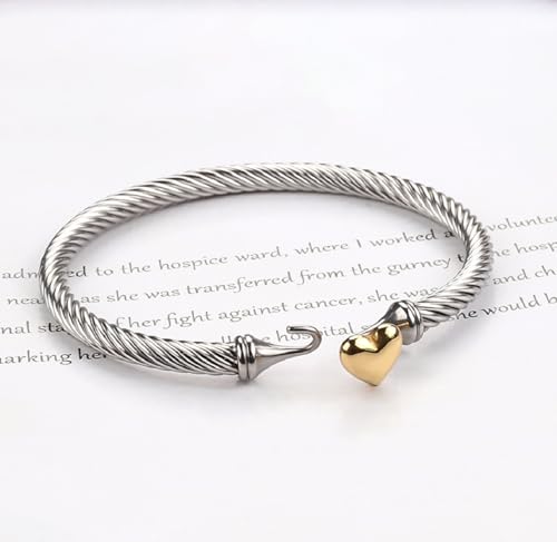 Adjustable Twist Stainless Steel Cable Wire 14K Gold Plated Love Heart Charm Bracelets Friendship Open Bangle Wrist Cuff for Women Men 7