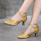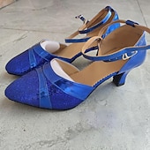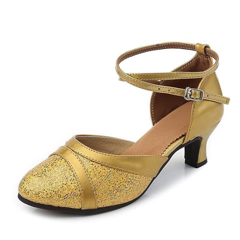 Highlights [Fabric] : Crafted from shimmering glitter materials, these women's ballroom shoes feature an upper made from sparkling glitter that not only ensures durability but also provides a stunning visual impact on the dance floor. The suede outsole offers excellent grip and smoothness for seamless movements. [Style] : The shoes are designed with a classic closed-toe and a flared heel that combines elegance with stability. The mid-heel design allows for graceful turns and spins, making them perfect for ballroom and Latin dance. [Design Highlights] : Featuring delicate, adjustable ankle straps, these shoes provide a secure and personalized fit. The flared heel adds a touch of sophistication while maintaining stability, allowing dancers to perform with confidence. [Occasions] : Ideal for stage performances, indoor practice sessions, and professional ballroom dance events. These shoes effortlessly blend style and functionality, making them a perfect choice for any dance occasion. [Size Range] : Available in sizes 34 to 41, ensuring a comfortable fit for a wide range of foot sizes. The shoes come in elegant color options of Blue, Gold, and Silver to complement any dancing outfit.