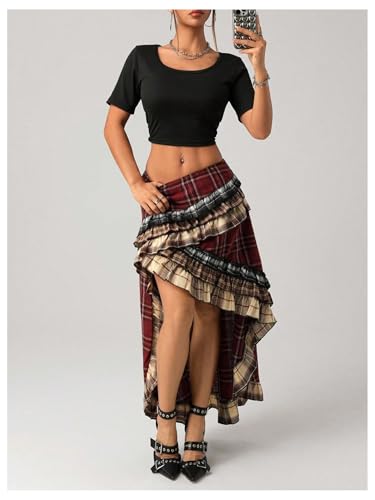 Verdusa Women's Tartan Plaid Maxi Skirt Layered Ruffle Asymmetrical Long Skirts 1