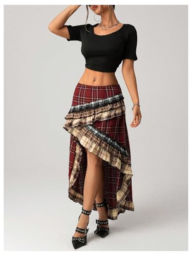 Verdusa Women's Tartan Plaid Maxi Skirt Layered Ruffle Asymmetrical Long Skirts