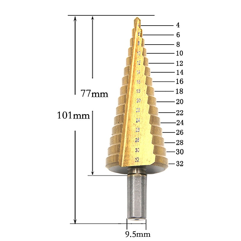 Highlights What is Step Drill Bit · Step drill bits can be used with metal and wood. · Useful for drilling pilot holes in woodworking and sheet metal-based projects. · Allows drilling holes of multiple sizes with same drill bit; can be used to clean away waste material in holes. What does titanium coating do? Titanium nitride (TiN) coating is wear resistant, inert and reduces friction . Use it on cutting tools, punches, dies and injection mold components to improve tool life two to ten times, or more, over uncoated tools.