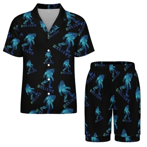 Bigfoot Sasquatch Believe Men‘s Short Sleeve Sleepwear Funny Pajamas Sets Button Down Shirts and Bottom Shorts Loungewear 1