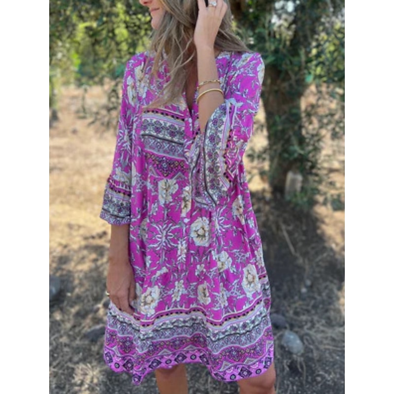 HOT ! Women's Midi Dress Casual Dress Boho Chic Dresses Bohemia Casual Boho Vacation Daily Beach Loose Fit Floral 3/4 Length Sleeve Shirt Collar Navy Blue Royal Blue Purple Summer Spring