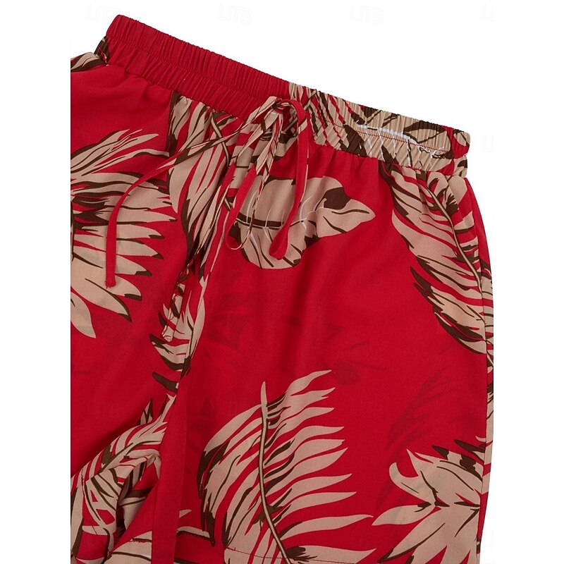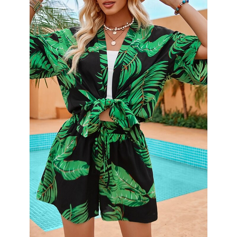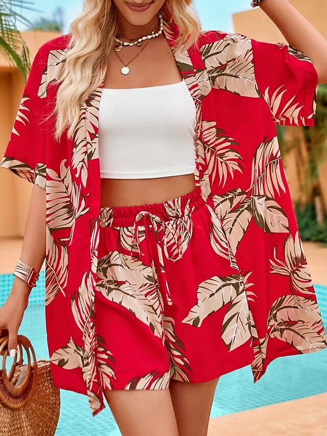 Women's Casual Jacket Suits Breathable Comfortable Drawstring Print Casual Leaf Vacation Street Holiday Daily Wear Open Front Regular Collarless Regular Fit Half Sleeve Outerwear Red Green Summer 9