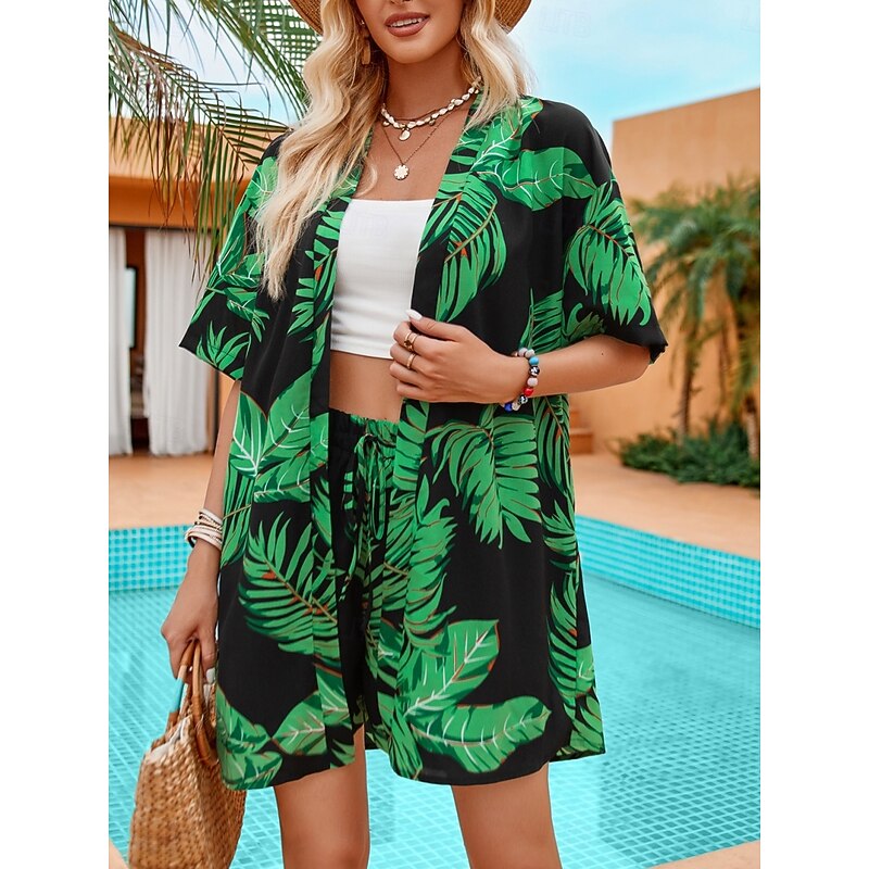 HOT ! Women's Casual Jacket Suits Breathable Comfortable Drawstring Print Casual Leaf Vacation Street Holiday Daily Wear Open Front Regular Collarless Regular Fit Half Sleeve Outerwear Red Green Summer