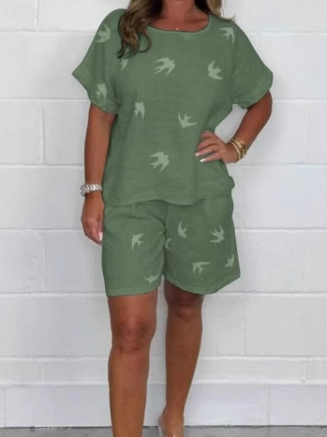 Women's Active Basic Cotton Linen Sets Shorts Sets Short Sleeve Crew Neck Geometric Print Holiday Casual Daily Black White Brown Summer Regular Fit 7