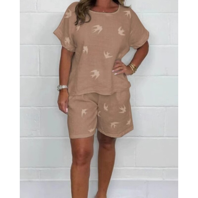 More information about Women's Active Basic Cotton Linen Sets Shorts Sets Short Sleeve Crew Neck Geometric Print Holiday Casual Daily Black White Brown Summer Regular Fit