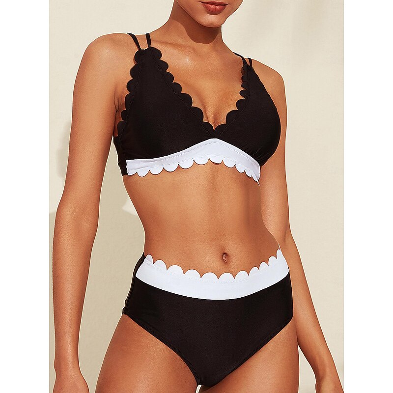 HOT ! Petal Border Longline Triangle Bikini Set Black And White
