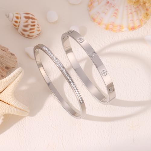• 【 Minimalist Design 】 Silver love bangle bracelet set for women feature charming designs, each bracelet can be worn individually or together with other bracelets or watches to create a sense of layering. A set of miniature love silver bangle stack for women and silver love bracelet can provide more choices for your varied clothing matching.