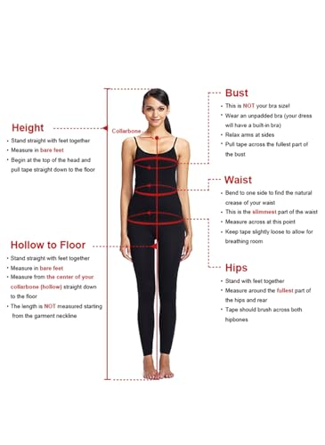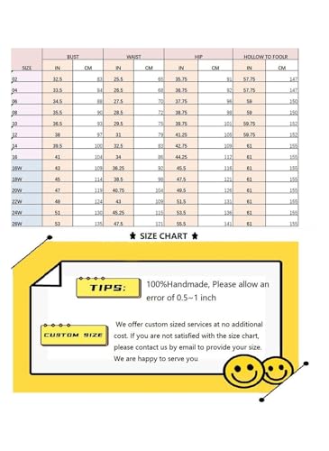 • SIZE DETAILS:Please refer to our size chart in the product image section on the left. PLEASE NOT AMAZON SIZE CHART. We accept free customization service, if you want to customize the dress, Please provide us your measurements of the Bust, Waist, Hips and Hollow to Floor when you place the order. The dress will be made fit you perfect, please contact with us by email within 12 hours after you place order.