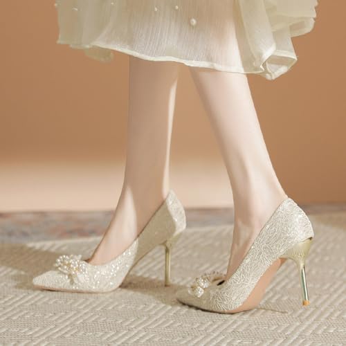 More information about Women's Pointed Closed Toe High Heel Pumps Dressy Pearl Flowers Lace Mesh Bridal Wedding Stilettos Heels Comfort Slip On Party Prom Dress Pumps