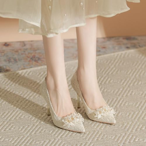 Women's Pointed Closed Toe High Heel Pumps Dressy Pearl Flowers Lace Mesh Bridal Wedding Stilettos Heels Comfort Slip On Party Prom Dress Pumps 7
