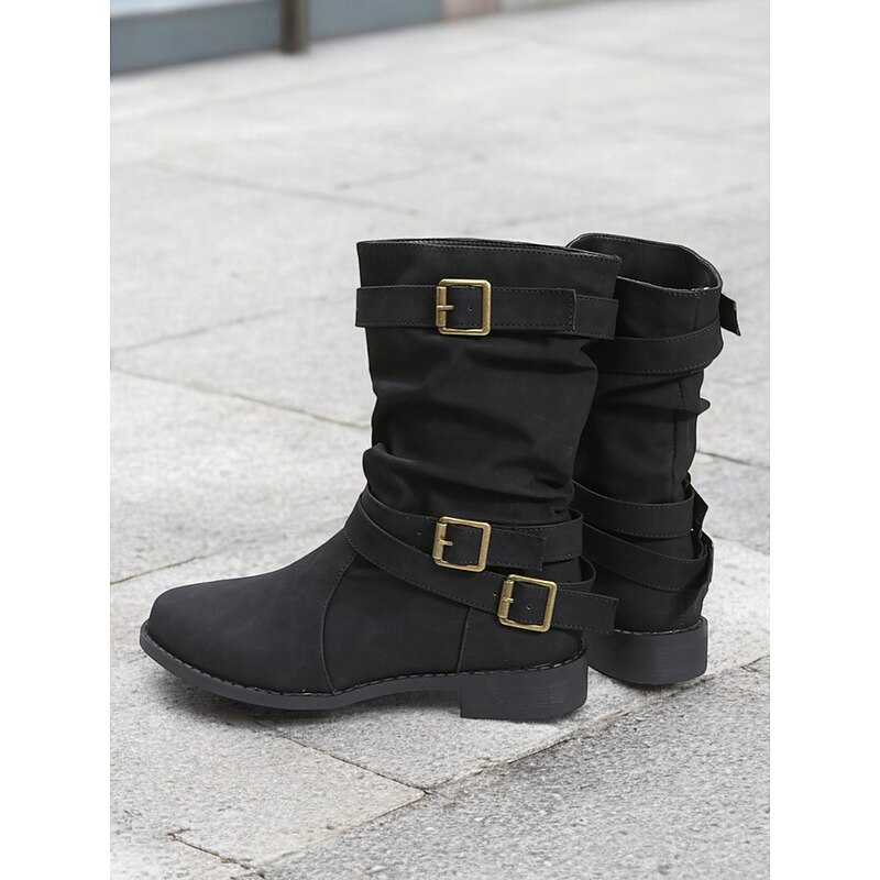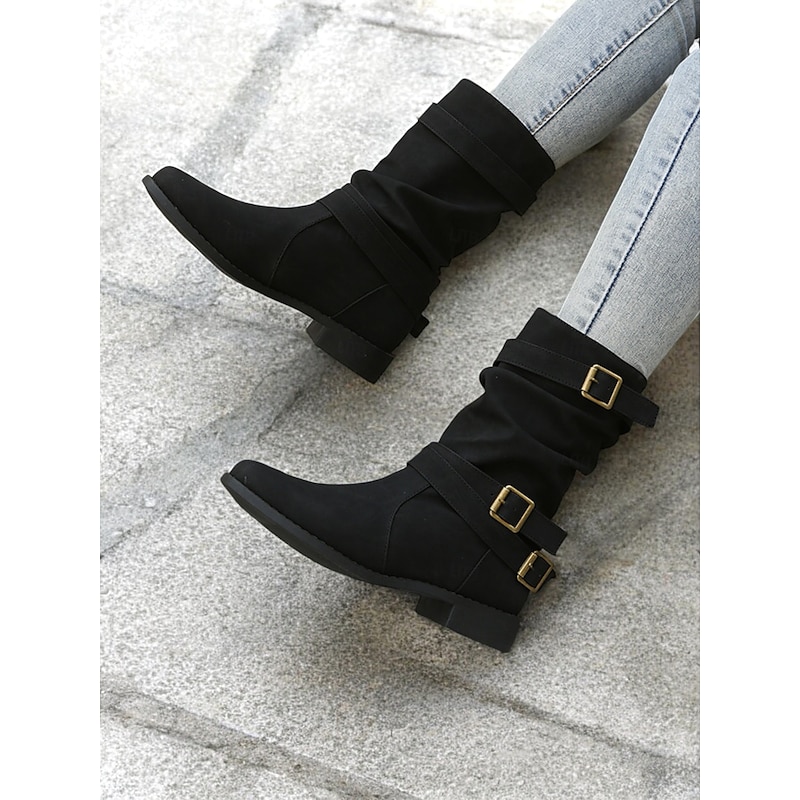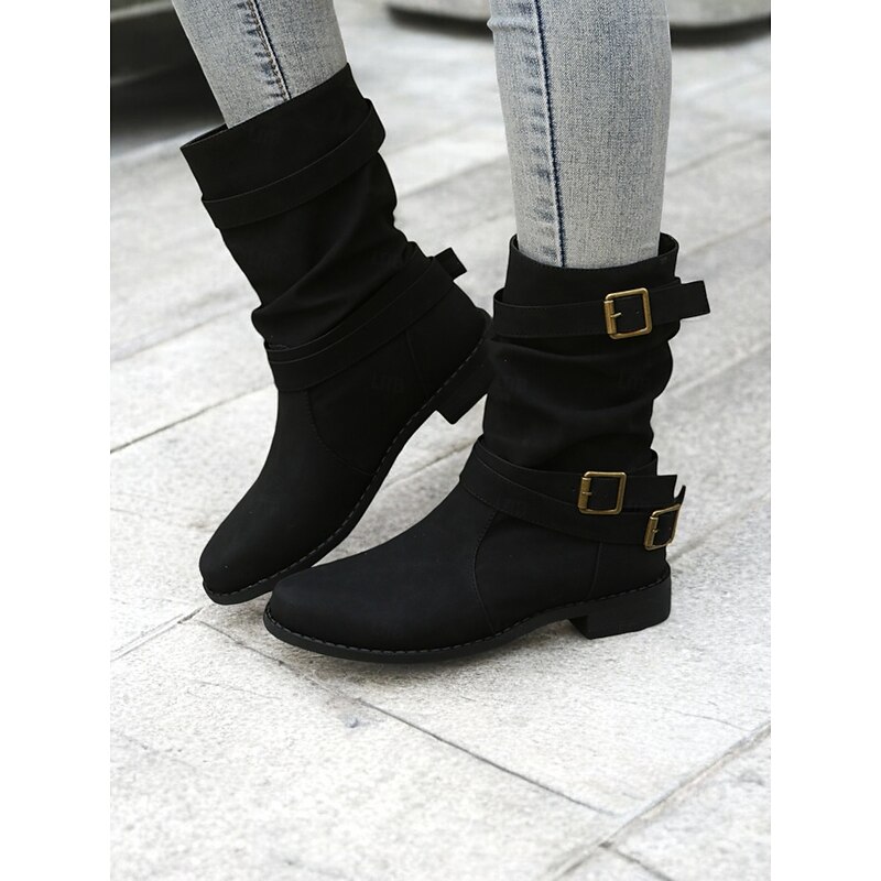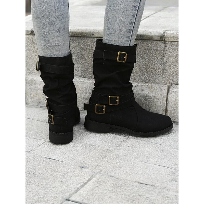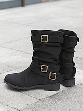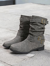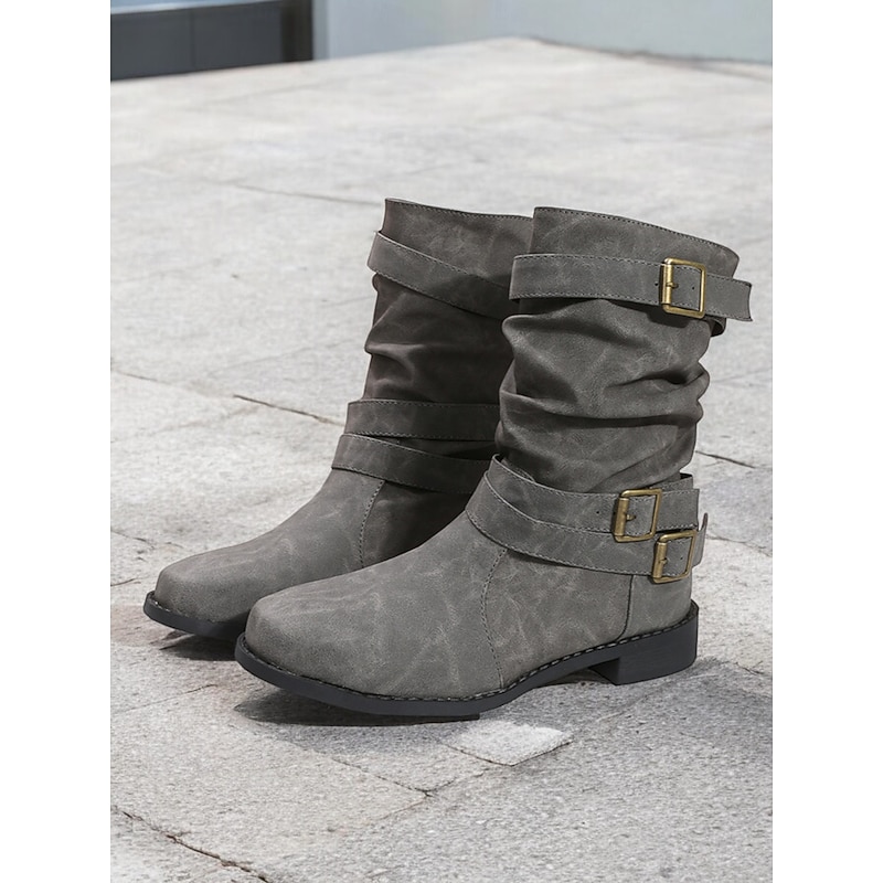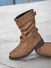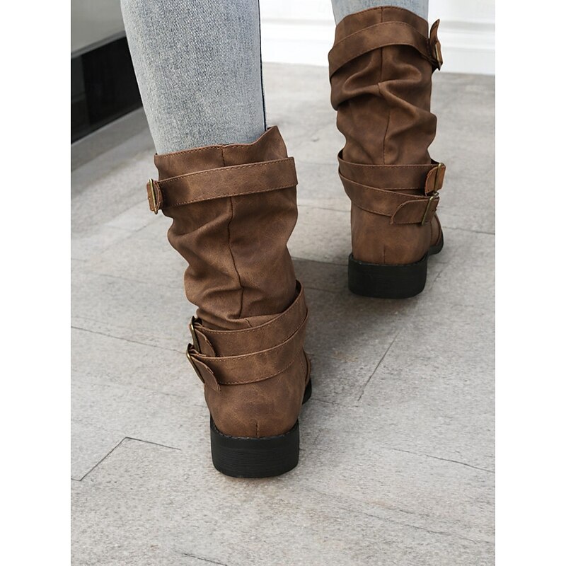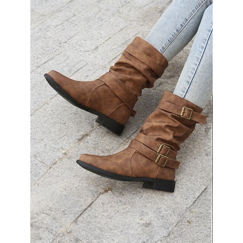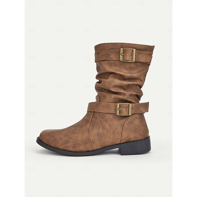 Highlights [Material] : Crafted from high-quality PU with a textile lining, these women's mid-calf boots offer a durable and comfortable fit suitable for the cooler seasons of spring, fall, and winter. The rubber outsole ensures excellent traction and stability, making them ideal for everyday wear. [Style] : Featuring a classic vintage brown finish, these boots embody a slouchy design that combines casual elegance with modern fashion. The low heel and round toe shape provide a comfortable and relaxed fit for all-day wear. [Design Highlights] : The boots are adorned with two decorative brass buckles, enhancing their rustic charm and allowing for slight adjustments to the fit. A convenient side zipper allows easy on and off, emphasizing both style and practicality. [Occasions] : Perfect for daily activities and work settings, these boots effortlessly pair with jeans or a casual dress. Their versatility makes them a great addition to any modern wardrobe, suitable for various casual and fashionable occasions, including vacation and fall fashion looks. [Size Notice] : Available in a range of sizes from US6 to US10.5, they come in standard sizing, so you can select your usual size with confidence.