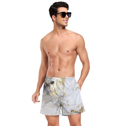 HOT ! Mens Swim Trunks Quick Dry Swim Shorts with Pockets Liner Marble White Gold