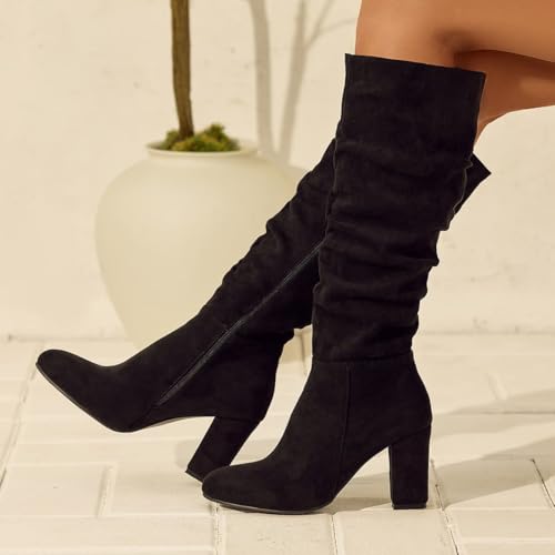 Womens Knee High Boots Chunky High Heel Round Toe Side Zipper Wide Calf Boot for Fall Winter Outfits 1