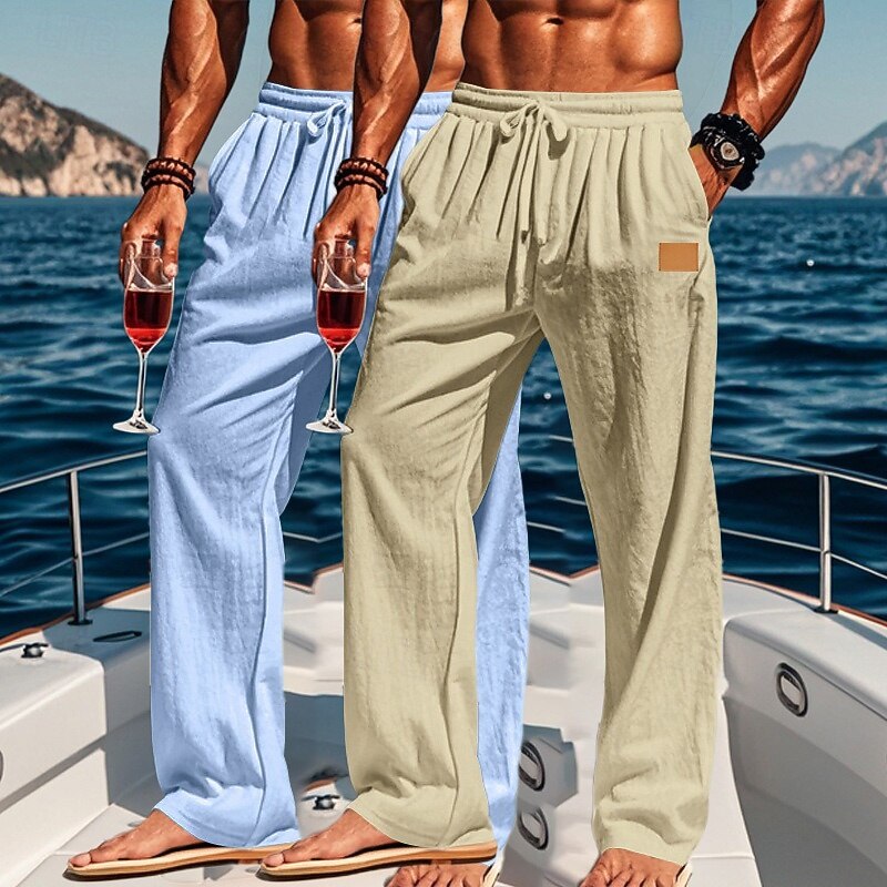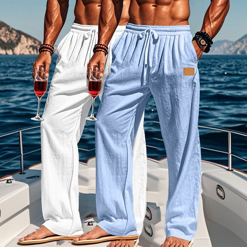 HOT ! Men's Linen Pants Trousers Summer Pants Baggy Pants Beach Pants Drawstring Elastic Waist Straight Leg Plain Comfort Breathable Full Length Outdoor Holiday Beach Vacation Fashion White+Sky Blue