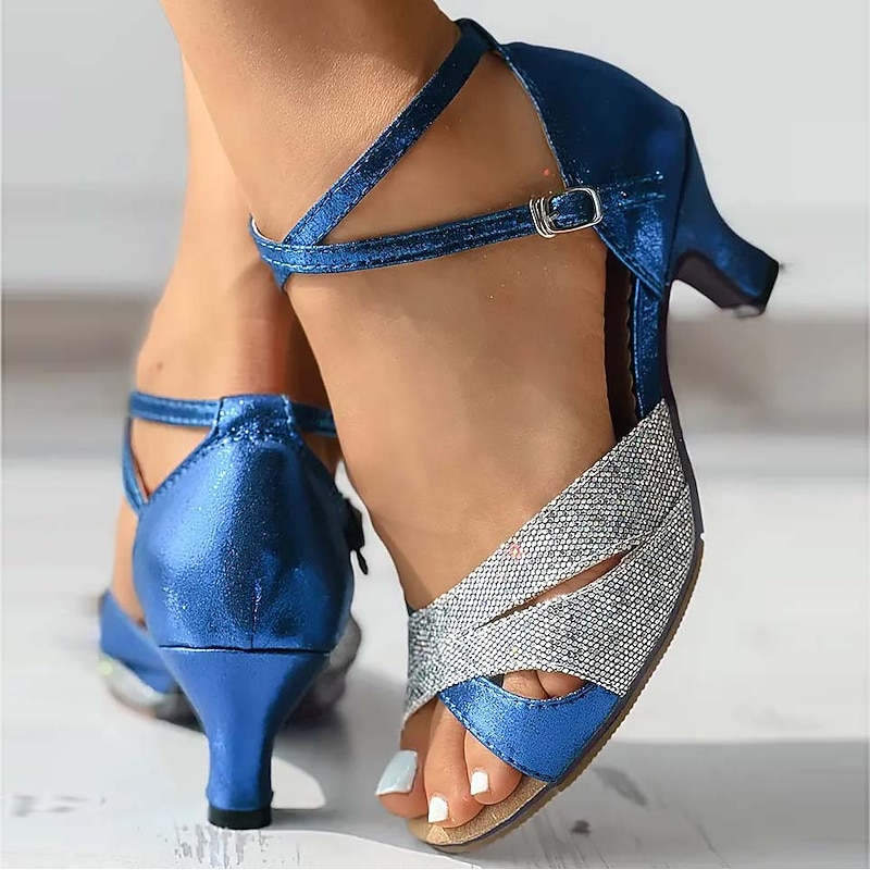 Highlights [Fabric] : Crafted from high-quality satin and PU, these women’s dance shoes boast a luxurious texture that accentuates the exquisite silver glitter and crystal embellishments. The durable rubber outsole ensures a secure grip for confident steps on the dance floor. [Silhouette] : Featuring a low to mid heel, these shoes offer a perfect balance between elegance and comfort, allowing for graceful movements. The open-toe design with subtle cut-outs enhances breathability while maintaining a chic aesthetic. [Design Highlights] : The shoes are adorned with rhinestone-embellished ankle straps that are adjustable for a personalized fit. The secure buckle closure not only provides stability but also adds a touch of sophistication to these vintage-inspired sandals. [Occasions] : Ideal for ballroom and Latin dance events, these sandals are suitable for a variety of occasions such as parties, club nights, and elegant gatherings. Their glittery design ensures you’ll stand out, enhancing both practice and performance experiences. [Size Advice] : Available in a wide range of sizes including US5.5 to US10.5, these shoes cater to various foot sizes, ensuring a comfortable fit. With heel height options ranging from 3.5cm to 5.5cm, there's a perfect choice for every dancer's preference.
