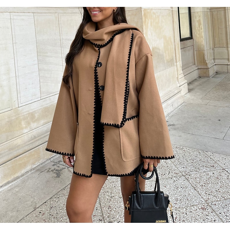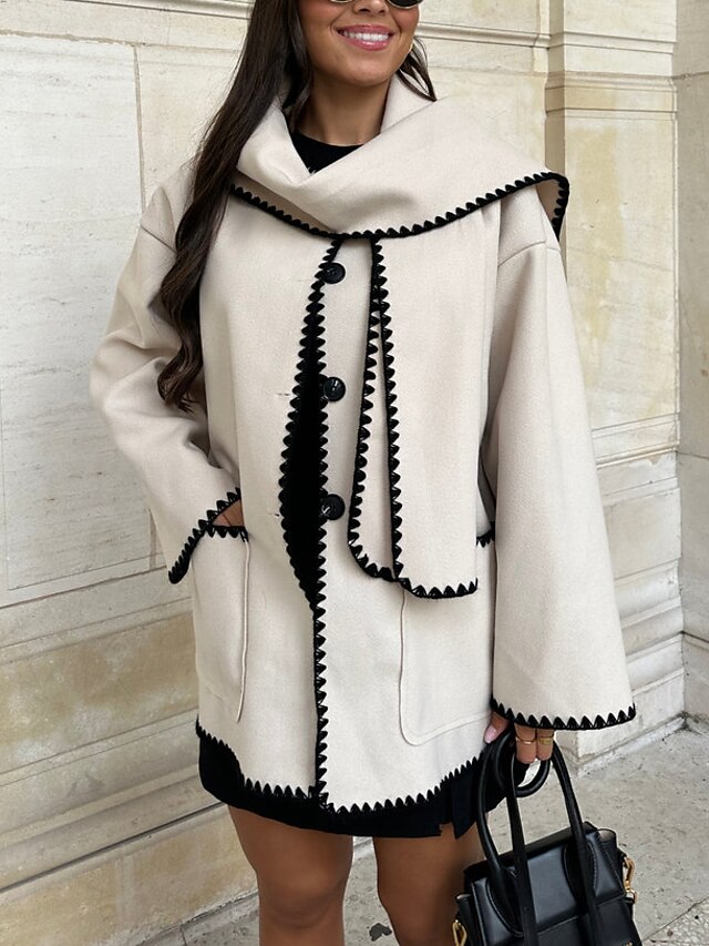 Highlights [Fabric] Crafted from a high-quality polyester blend, this women's coat offers a warm and cozy experience perfect for the colder months. The fabric provides a soft touch with micro-elasticity, ensuring both comfort and ease of movement. [Fit] Designed with a loose fit, this coat allows for effortless layering over various outfits. Its regular length and relaxed silhouette make it a versatile addition to any wardrobe, suitable for daily wear. [Design Highlights] The coat features a contemporary wide, draping collar and elegant scalloped trim in contrasting black, which adds a sophisticated touch to the soft beige base. It is embellished with intricate embroidery and secured with large, trendy black buttons for a chic finish. Practical front pockets enhance both the utility and aesthetic of the coat. [Occasions] Ideal for fall and winter, this coat seamlessly transitions from work to casual outings. Whether dressing for a day at the office or a night out, its classic and modern design makes it suitable for every setting. [Size Range] Available in sizes S, M, L, and XL, this coat caters to a wide range of body types, offering a flattering fit for everyone. Perfect for everyday use. top-grade materials and excellent craftsmanship ensure long-lasting durability.