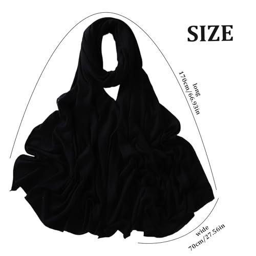 • Generous Size: Measuring 67x28 inches, this long black hijab offers ample coverage, allowing for versatile styling options. Drape it, wrap it, or layer it to suit your personal style and occasion.