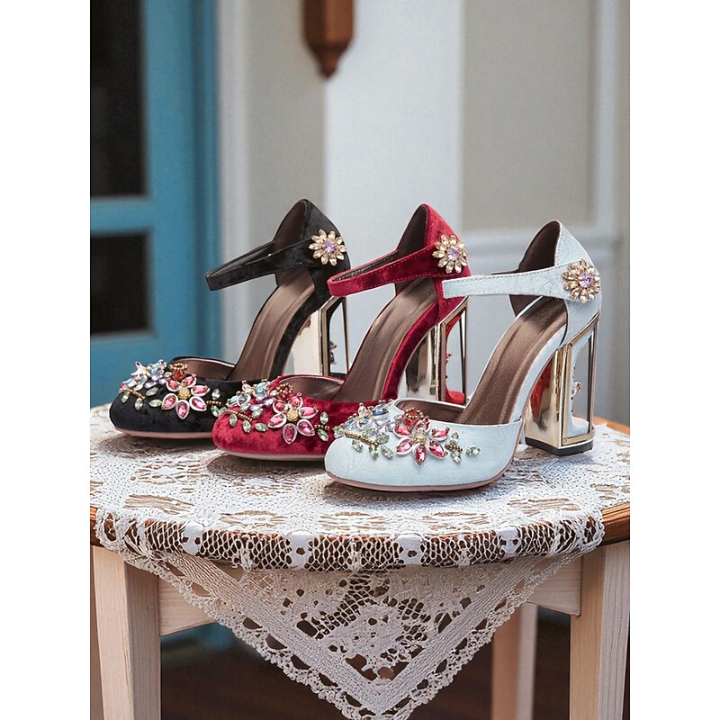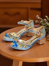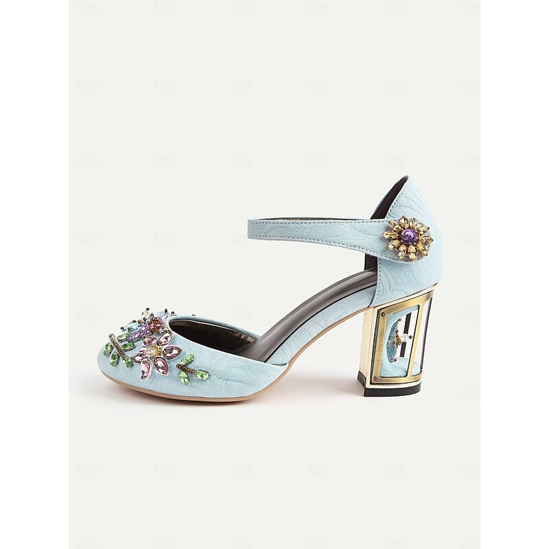 HOT ! Women's Light Blue Chunky Heel Dress Shoes with Gemstone Floral Embellishments - Elegant Vintage-Inspired Ankle Strap Pumps for Ladies, Ideal for Weddings, Garden Parties, and Medieval Fantasy-Themed