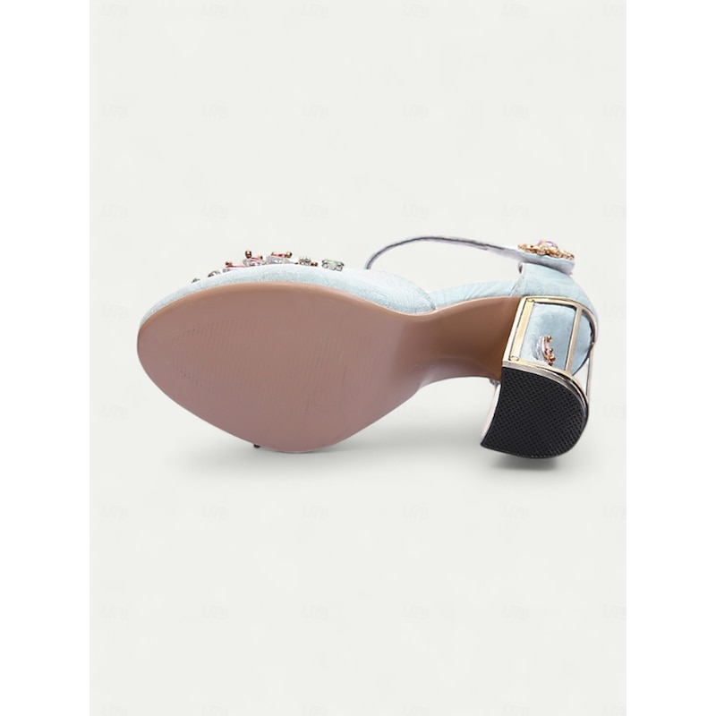 Women's Light Blue Chunky Heel Dress Shoes with Gemstone Floral Embellishments - Elegant Vintage-Inspired Ankle Strap Pumps for Ladies, Ideal for Weddings, Garden Parties, and Medieval Fantasy-Themed 26