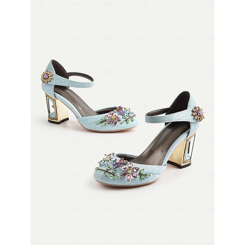 Women's Light Blue Chunky Heel Dress Shoes with Gemstone Floral Embellishments - Elegant Vintage-Inspired Ankle Strap Pumps for Ladies, Ideal for Weddings, Garden Parties, and Medieval Fantasy-Themed 24