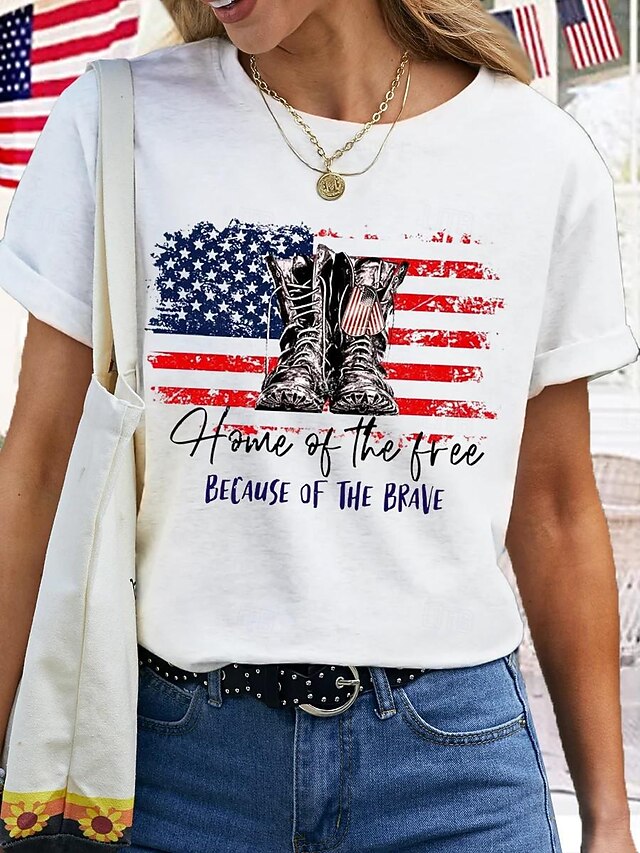 Highlights [Fabric]: Crafted from 100% soft cotton, this T-shirt ensures both comfort and breathability, making it ideal for casual summer wear. The fabric offers a micro-elastic quality for a slight stretch, enhancing ease of movement. [Fit]: Featuring a regular fit, this women's T-shirt provides a relaxed silhouette that pairs effortlessly with denim or casual bottoms. It offers a classic, laid-back style for everyday use. [Design Highlights]: The T-shirt showcases a bold American flag print, complete with a distressed effect and the phrase "Home of the Free, Because of the Brave" that complements the patriotic theme. The rolled short sleeves and crew neckline add to the casual and timeless appeal. [Occasions]: Perfect for casual weekends, summer outings, or festivities like Independence Day, this tee allows you to express your patriotism with style. It's an excellent choice for showcasing national pride throughout the year. [Size Range]: Available in a variety of sizes, including S, M, L, XL, and 2XL, this T-shirt is designed to accommodate different body types, ensuring a comfortable fit for everyone.