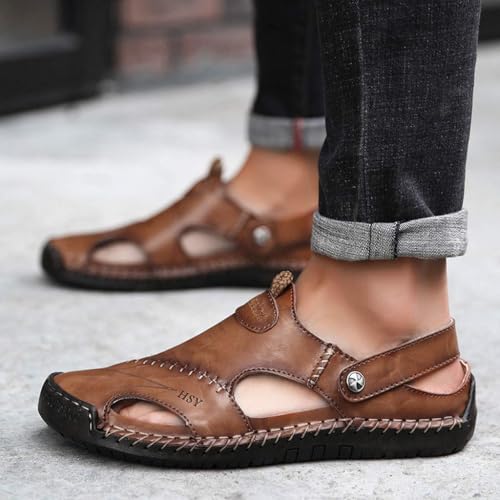 Large Size Soft Leather Men's Breathable Outdoor Sandals, Mens Outdoor Leather Sandals Closed Toe, Casual Beach Sandals 5