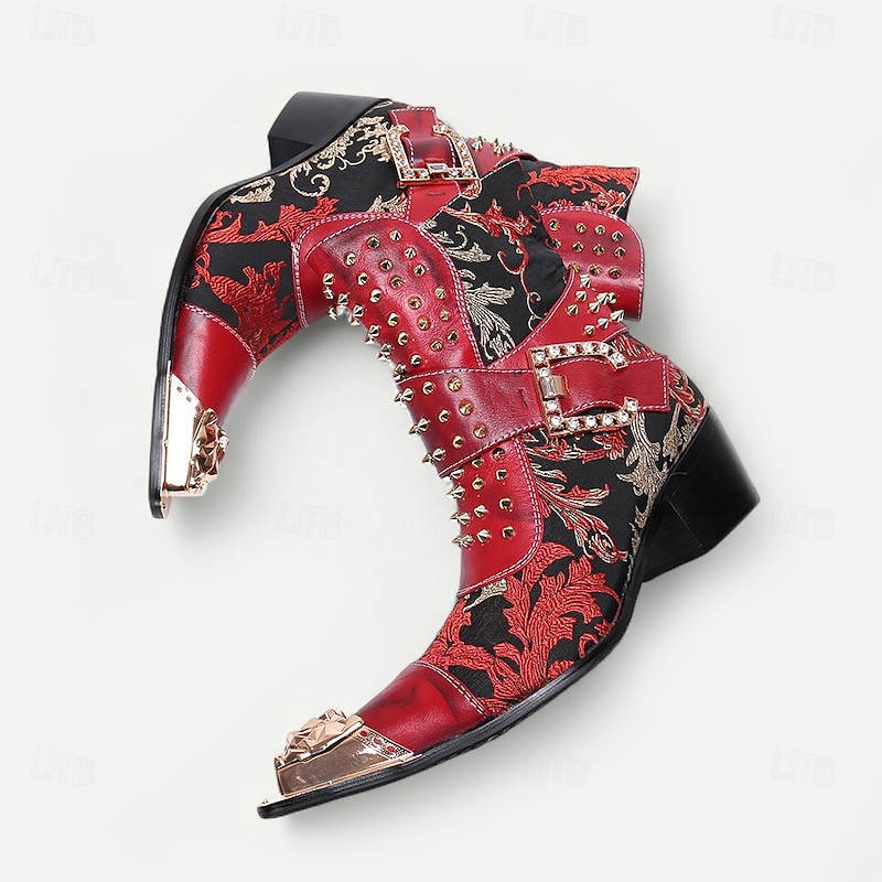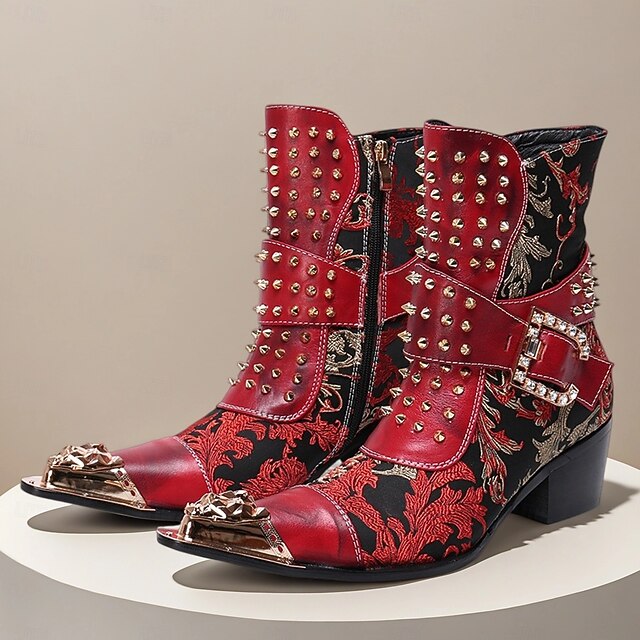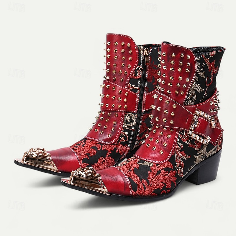HOT ! Men's Red Studded Gothic Ankle Boots – Punk Rock Style Leather Buckle Boots with Side Zipper for Concerts, Festivals and Party Fashion