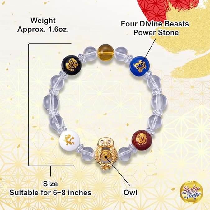 Material: StoneMetal type: BrassClasp type: ToggleChain type: BeadedGem type: Crystal✅It is a bracelet engraved with Japanese feng shui four deities in gold. It is a crystal bracelet for women and men for attractoing the strongest fortune, which is said to make all wishes come true just by wearing it, combining four feng shui deities and power stones.🦉The owl is a world-famous lucky bird. For centuries, owls have been known on every continent as a bird of good luck. In America, owl was worshiped as a prophet who predicted danger and as a god of hunting. In Europe, owl was a symbol of intelligence, and in Egypt owl was considered a mystical spirit, and is also represented in hieroglyphs. In Japan, owl is a messenger of good luck and is worshiped as a god in some regions.In Australia, owl has been believed that there is a sacred voice that brings happiness. In this way, owls are considered lucky charms not only in Feng Shui, but all over the world. Wear this good luck charm bracelet and harness the power of the owl along with the good luck methods of Feng Shui.✅The feng shui four deities, also good luck charms. Said to be the supreme guardians are the Red Phoenix, Blue Dragon, Black Tortoise, and White Tiger. The Red Phoenix governs friendship and family prosperity, the Blue Dragon guides us to success, the Black Tortoise supports our health, and the White Tiger represents great wealth. This arrangement of the four Feng Shui gods is not only considered a good luck charm, but also a Feng Shui method that brings good fortune.✅The crystal held by the owl has a 3-Way mark on it. This is the official mark of the shrine, a sign that it has been prayed for by the Chief Priest, and the shrine boasts over 1,200 years of history and is even considered a sanctuary of good luck for money. 💎Crystal quartz, which supports the four deities, is another lucky stone that is also said to have universal power. Also known as the stone of harmony, it summarizes the power of this crystal bracelet.✅This crystal bracelet is suitable for women and men. Easy to put on as the rubber stretches. 6 to 8 inches wrist circumference. Weight (approx.): 1.06 oz It can be worn on either the left or right hand. Perfect for everyday use. superior materials and excellent craftsmanship ensure long-lasting durability.