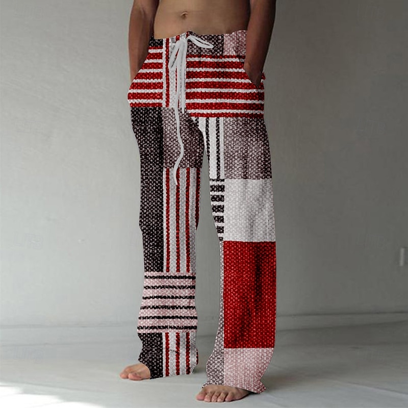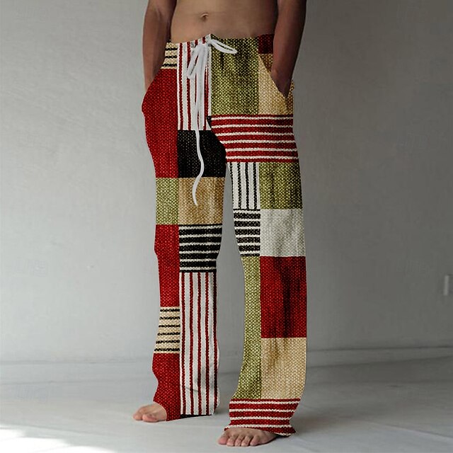 More information about Men's Casual Pants Drawstring Pocket Straight Leg Geometric Color Block Patchwork Vacation Casual Pink Red Inelastic