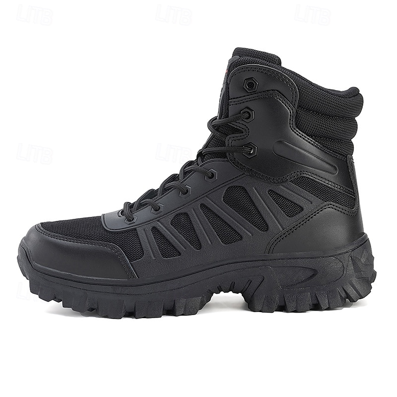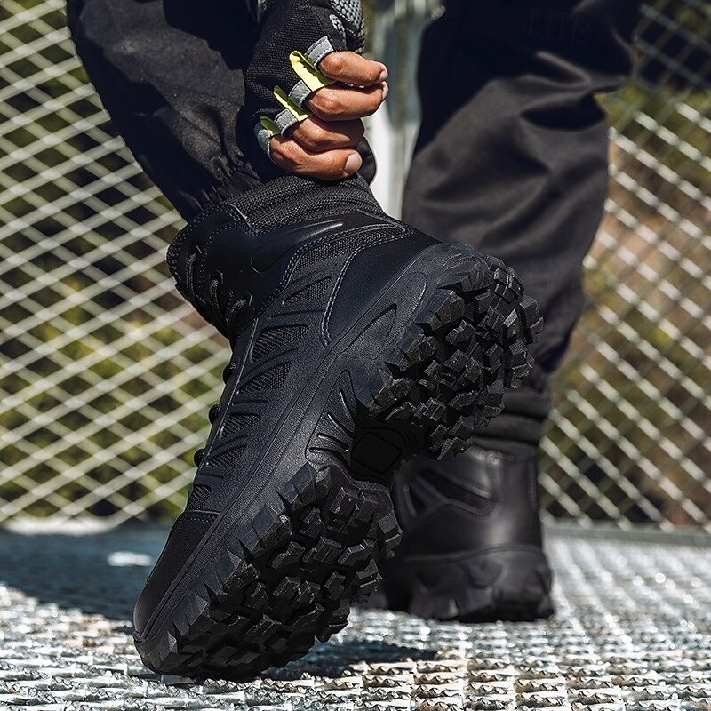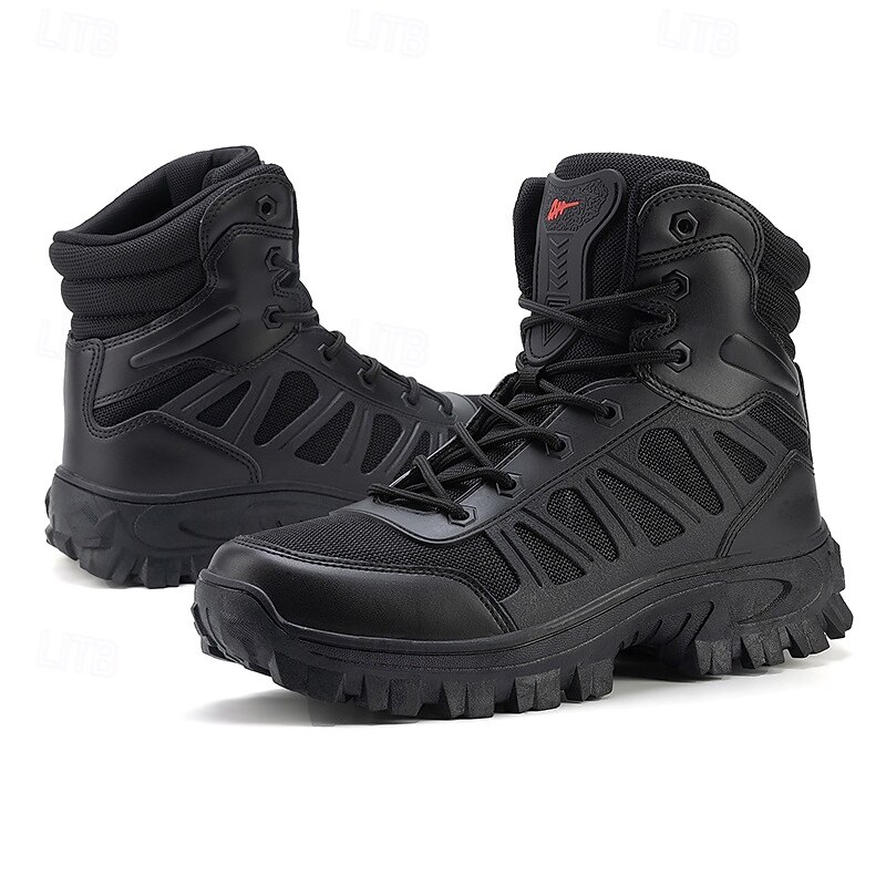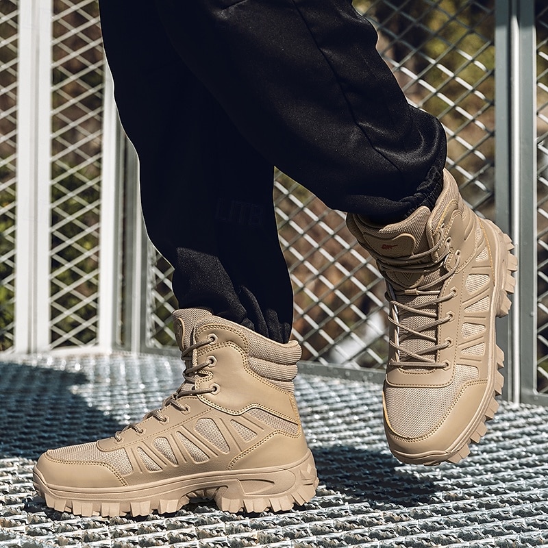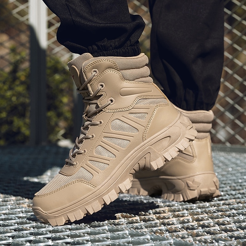 Highlights [Fabric] The Men's Tactical Combat Boots are crafted with a durable PU Leather and Nylon upper, combined with breathable mesh lining for superior ventilation and comfort. This ensures the boots are both strong and lightweight, perfect for prolonged use in outdoor settings. [Fit] Designed with an ankle-high profile, these boots offer excellent support and stability for various activities. The padded collar and tongue provide additional comfort, making them suitable for all-day wear. The lace-up closure with reinforced eyelets ensures a secure fit tailored to your needs. [Design Highlights] Featuring a sleek, modern aesthetic in neutral tones like black and brown, these boots blend seamlessly with outdoor environments. The deep treads on the rubber outsole guarantee superior grip across diverse terrains, while the cushioned insole offers exceptional shock absorption. [Occasions] Ideal for hiking, work, and outdoor activities, these tactical boots are suited for those who need reliable, high-performance footwear. Whether you're an outdoor enthusiast or a professional in demanding environments, these boots deliver the robustness and comfort necessary for challenging conditions. [Size Range] Available in a wide range of sizes from US7 / EU39 / UK6 to US11 / EU44 / UK10, these boots cater to various foot sizes to provide an optimal fit for every wearer.