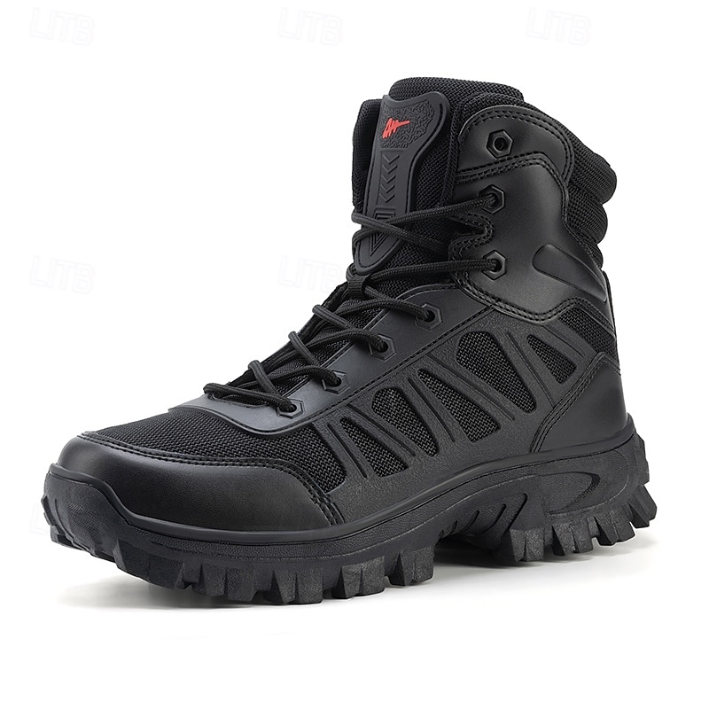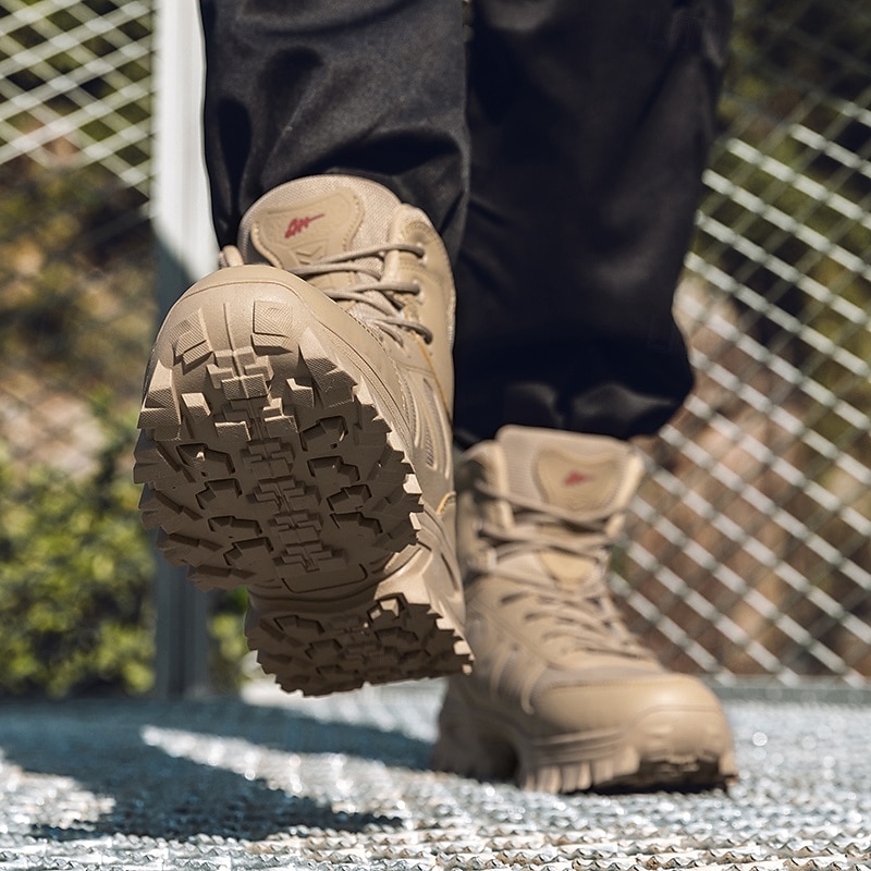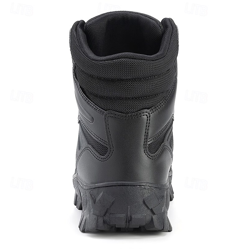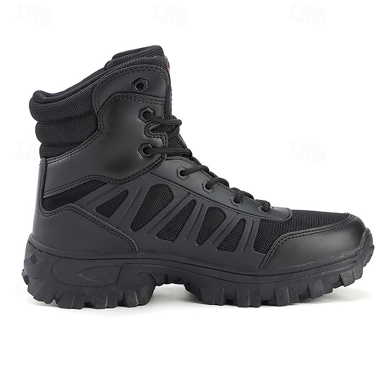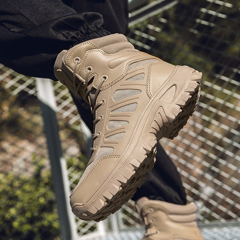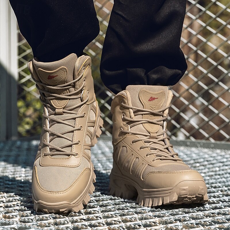 Highlights [Fabric] The Men's Tactical Combat Boots are crafted with a durable PU Leather and Nylon upper, combined with breathable mesh lining for superior ventilation and comfort. This ensures the boots are both strong and lightweight, perfect for prolonged use in outdoor settings. [Fit] Designed with an ankle-high profile, these boots offer excellent support and stability for various activities. The padded collar and tongue provide additional comfort, making them suitable for all-day wear. The lace-up closure with reinforced eyelets ensures a secure fit tailored to your needs. [Design Highlights] Featuring a sleek, modern aesthetic in neutral tones like black and brown, these boots blend seamlessly with outdoor environments. The deep treads on the rubber outsole guarantee superior grip across diverse terrains, while the cushioned insole offers exceptional shock absorption. [Occasions] Ideal for hiking, work, and outdoor activities, these tactical boots are suited for those who need reliable, high-performance footwear. Whether you're an outdoor enthusiast or a professional in demanding environments, these boots deliver the robustness and comfort necessary for challenging conditions. [Size Range] Available in a wide range of sizes from US7 / EU39 / UK6 to US11 / EU44 / UK10, these boots cater to various foot sizes to provide an optimal fit for every wearer.