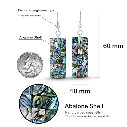 • Earrings Type: Pierced Dangle | Closure: Fish Hooks | Overall Measurements: 18 mm (0.71 in) wide x 60 mm (2.36 in) long | Weight: 4.1 grams| Stone: Abalone Shell, Kabibe shell