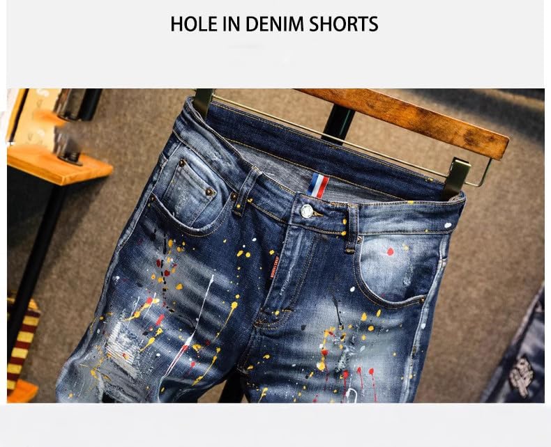 More information about Men Street Jeans Retro Blue Paint Splatter Slim Fit Ripped Jeans Mens Stretch Trousers Hip Hop Denim ​​Trousers