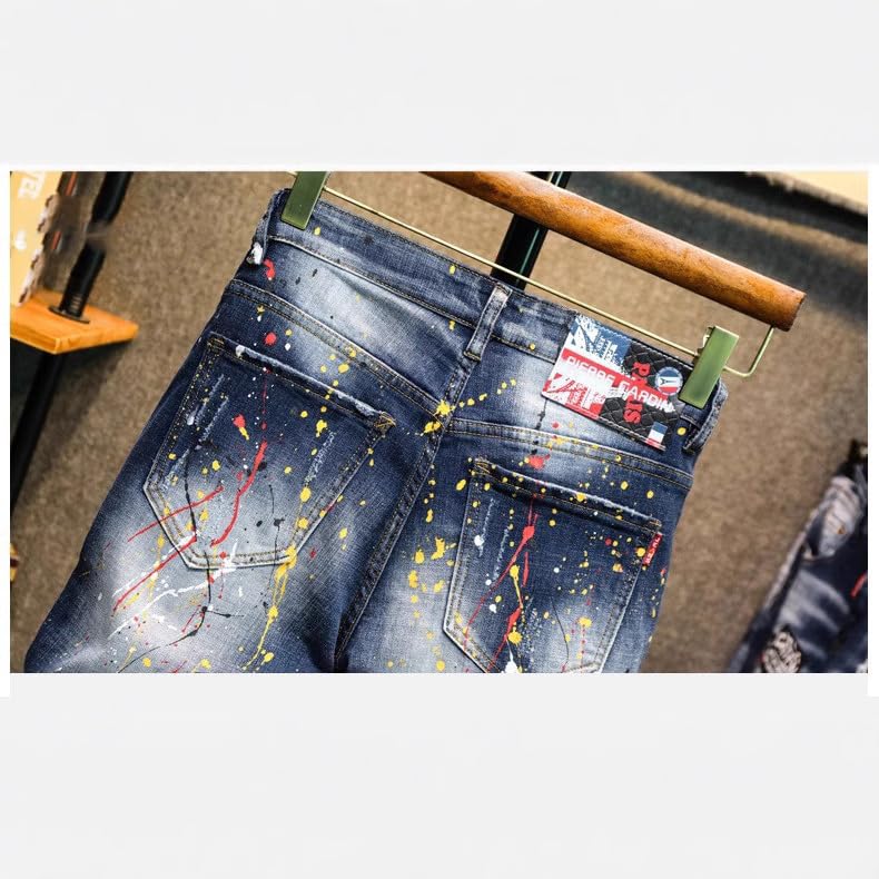Men Street Jeans Retro Blue Paint Splatter Slim Fit Ripped Jeans Mens Stretch Trousers Hip Hop Denim Trousers