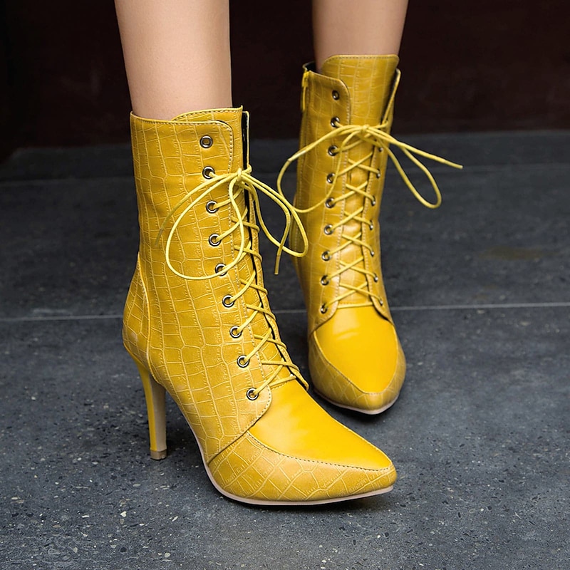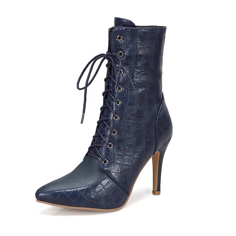 More information about Women's Black Crocodile Pattern Lace-Up Stiletto Ankle Boots – Sleek High Heel Fashion Boots for Formal and Evening Wear