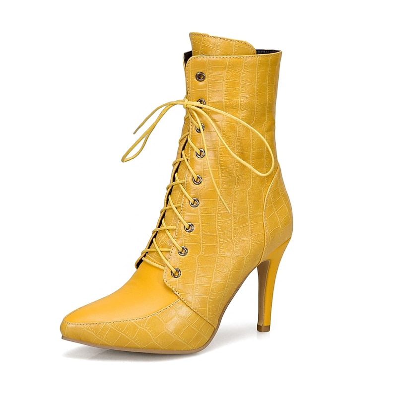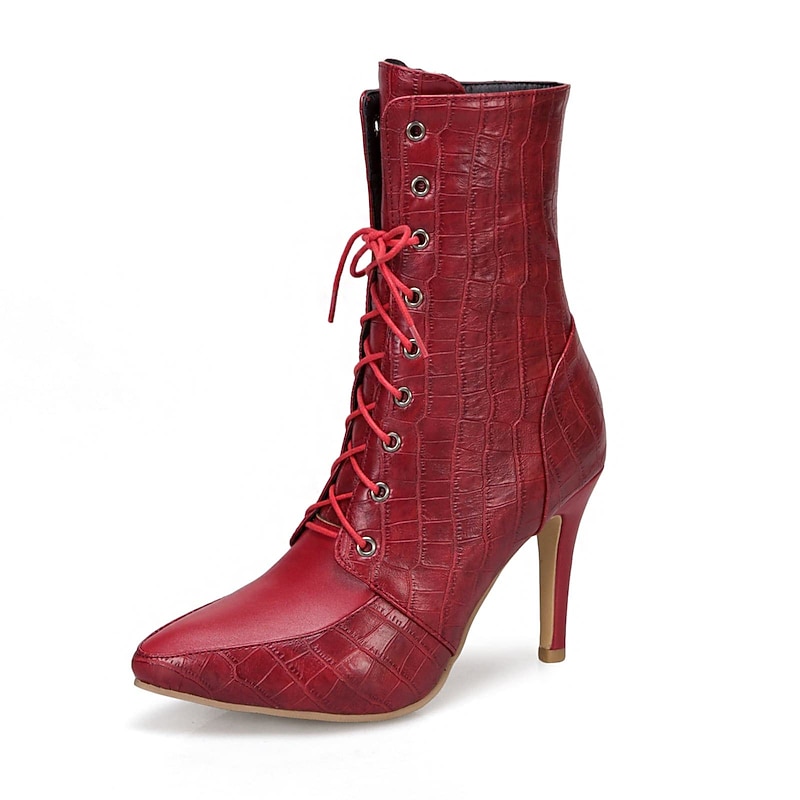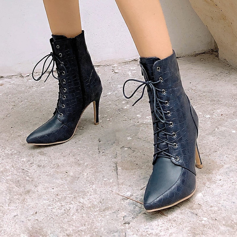 HOT ! Women's Black Crocodile Pattern Lace-Up Stiletto Ankle Boots – Sleek High Heel Fashion Boots for Formal and Evening Wear
