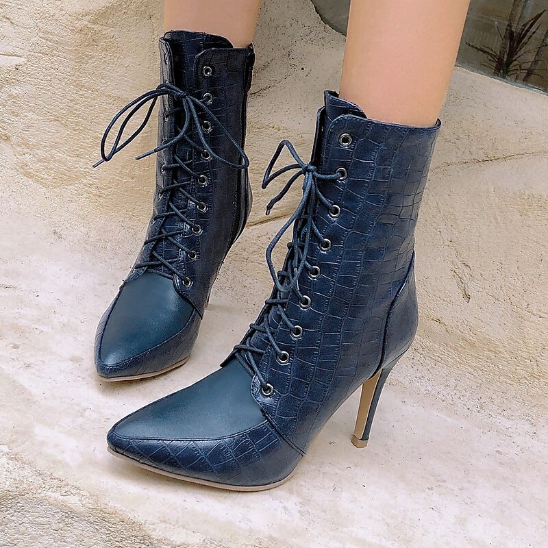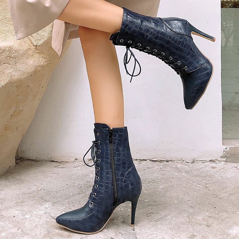 Women's Black Crocodile Pattern Lace-Up Stiletto Ankle Boots – Sleek High Heel Fashion Boots for Formal and Evening Wear 21
