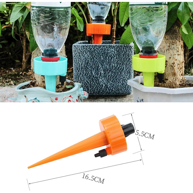 Highlights - Made from premium quality PP plastic for high strength and toughness, good heat and cold resistance, and durability in use. - Unique constant pressure design delivers a steady water flow without the need for drilling or cutting bottles. Simply fix the spike on the bottle and start using. - Universal fit for most bottles with a 28mm opening, making it easy to find on the market. - Controllable flow with precise valve control switches, allowing you to adjust the water flow according to your plants' needs, preventing over or under watering. - Leave your plants at home with confidence while you travel with family, as these devices provide accurate and steady water drips for your plants without having to water every day.