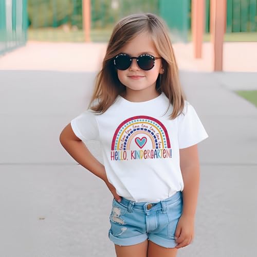 • 【Design】Celebrate the big milestone with this adorable kindergarten shirt girl. The vibrant rainbow print and playful "Hello Kindergarten" text make it a cheerful choice for first day of kindergarten photos, it’s ideal for back to school outfits. A must-have back to school outfit that boosts confidence and excitement for the school year ahead! The bright colors make it a hit for kindergarten shirts for girls. Pair it with jeans or skirts for a cute first day of kindergarten shirt look.