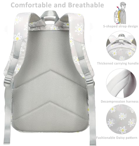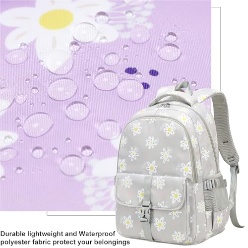 Unique Daisy Printed Backpack for Girls: Spacious Dimension: 12.2x8.27x17.72 (L*W*H); Weight: 0.54kg/1.19 lb; Capacity: 29 L; Big Student Backpack for gilrs, women, perfect for school and casual day trips.Water-resistant Backpack: The girls backpack for school is made of high-quality waterproof nylon fabric, there is no need to worry about books getting wet in rainy days, it is lightweight, wear-resistant and easy to clean, very durable for daily use.Multiple Pocket and Spacious: Main bag with inner laptop compartment which it is spacious enough to fit 16inch laptop, iPad, A4 binders, text books, lunch box, etc. The second pocket and 4 small pockets fit the school basic essential, note book, pencil case. The front buckle pocket can hold the daily stuffs and quick access them; Elastic side pockets are for water bottle and umbrella.Comfortable & Breathable: This girls school bag features ergonomical design, adopted with a breathable and thickened sponge of the padded shoulder strap and back panel, this cute backpack make the girls comfortable to wear, relaxing their shoulder and reducing pressure. A strap and a sponge decompression handle on the top to reduce the burden. High quality zippers. Sturdy constructions.Daisy Bookbag for Girls: Fashionable Daisy print design, a variety of cute and fresh colors, giving children the most comfortable and best feeling, is the perfect gift and best choice for children back to school! Perfect for preschool, primary, elementary, middle high school students daily use, camping, hiking, traveling and school, etc. Ideal served as school bags for girls, laptop backpack, casual rucksack, and travel backpack. Perfect for everyday use. High quality materials and excellent craftsmanship ensure long-lasting durability.