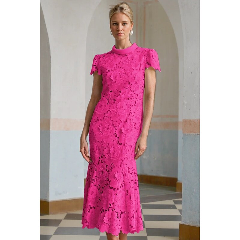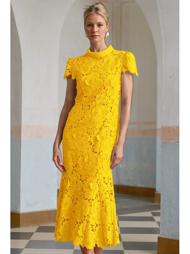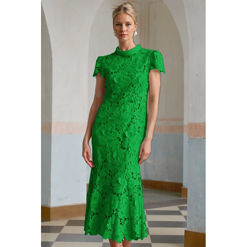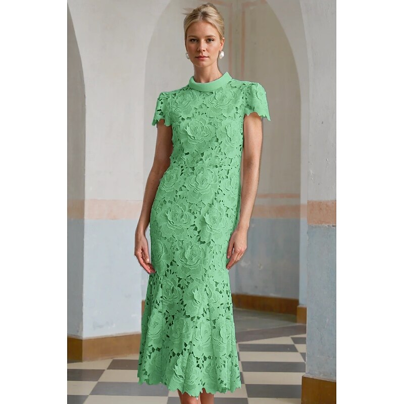 Column Cocktail Elegant Embroidered Dress Formal Wedding Ankle Length Short Sleeve Stand Collar Lace with Slit 1