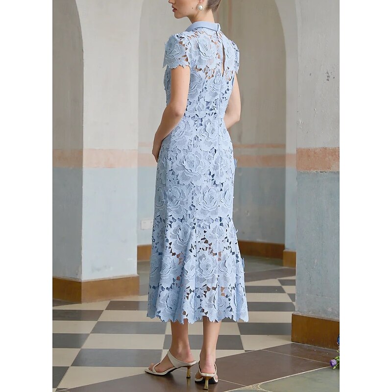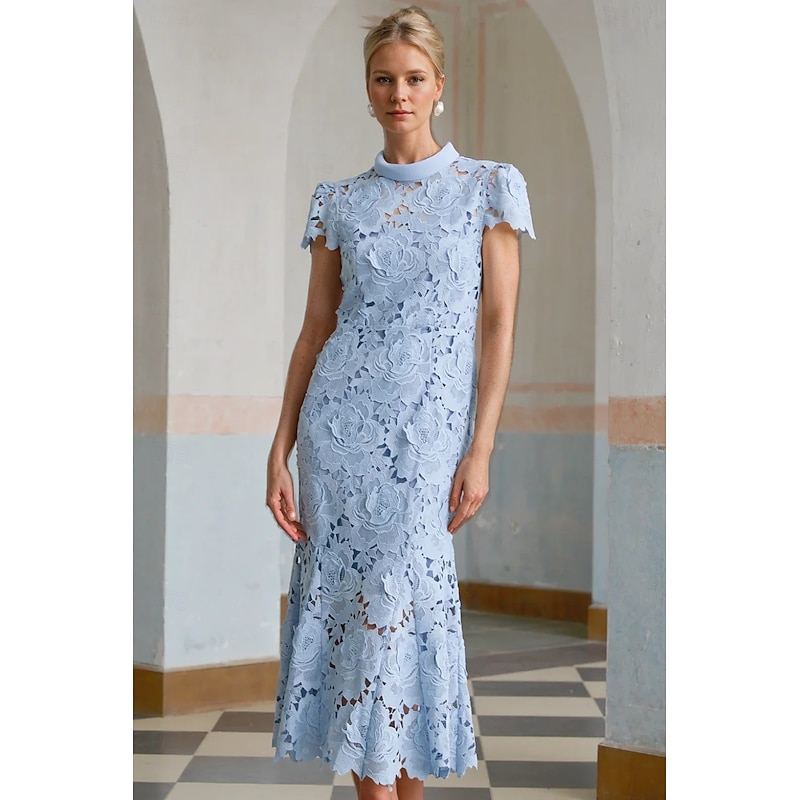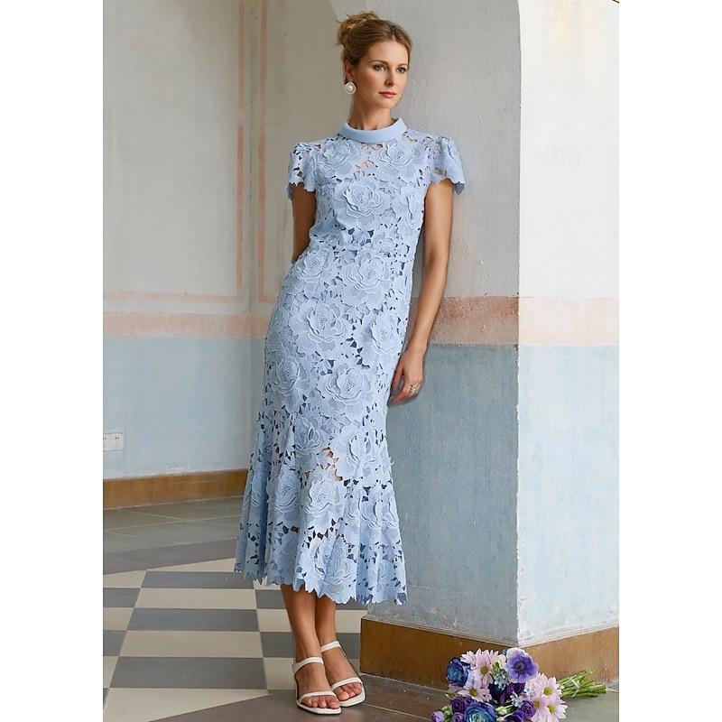 More information about Column Cocktail Elegant Embroidered Dress Formal Wedding Ankle Length Short Sleeve Stand Collar Lace with Slit